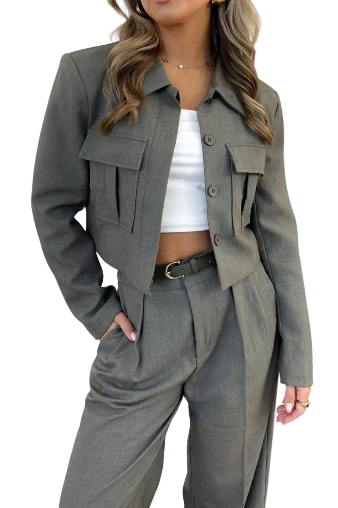 - Cropped length ending above the waist