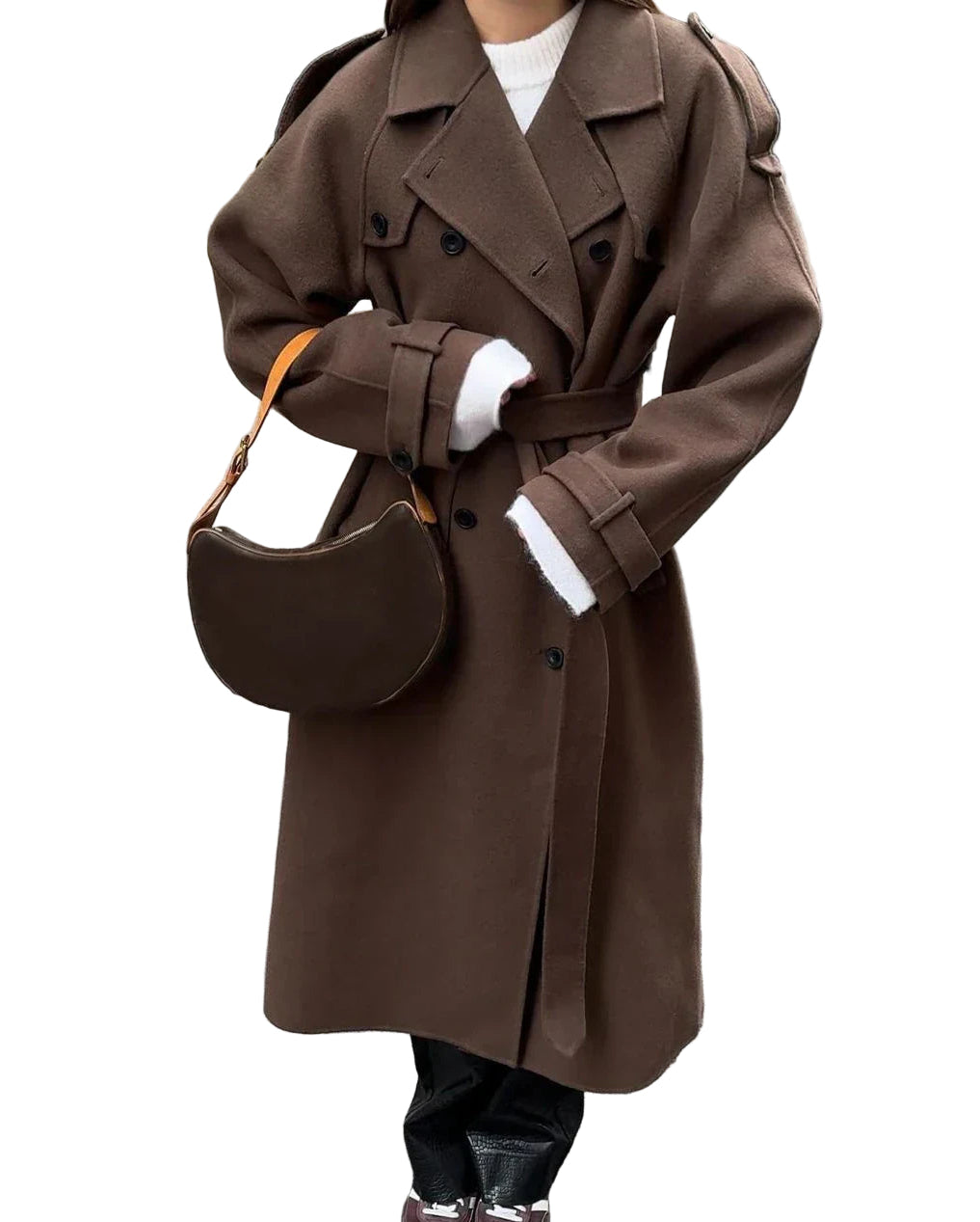 Women's Double-Breasted Belted Coat with Wide Collar and Long Sleeves