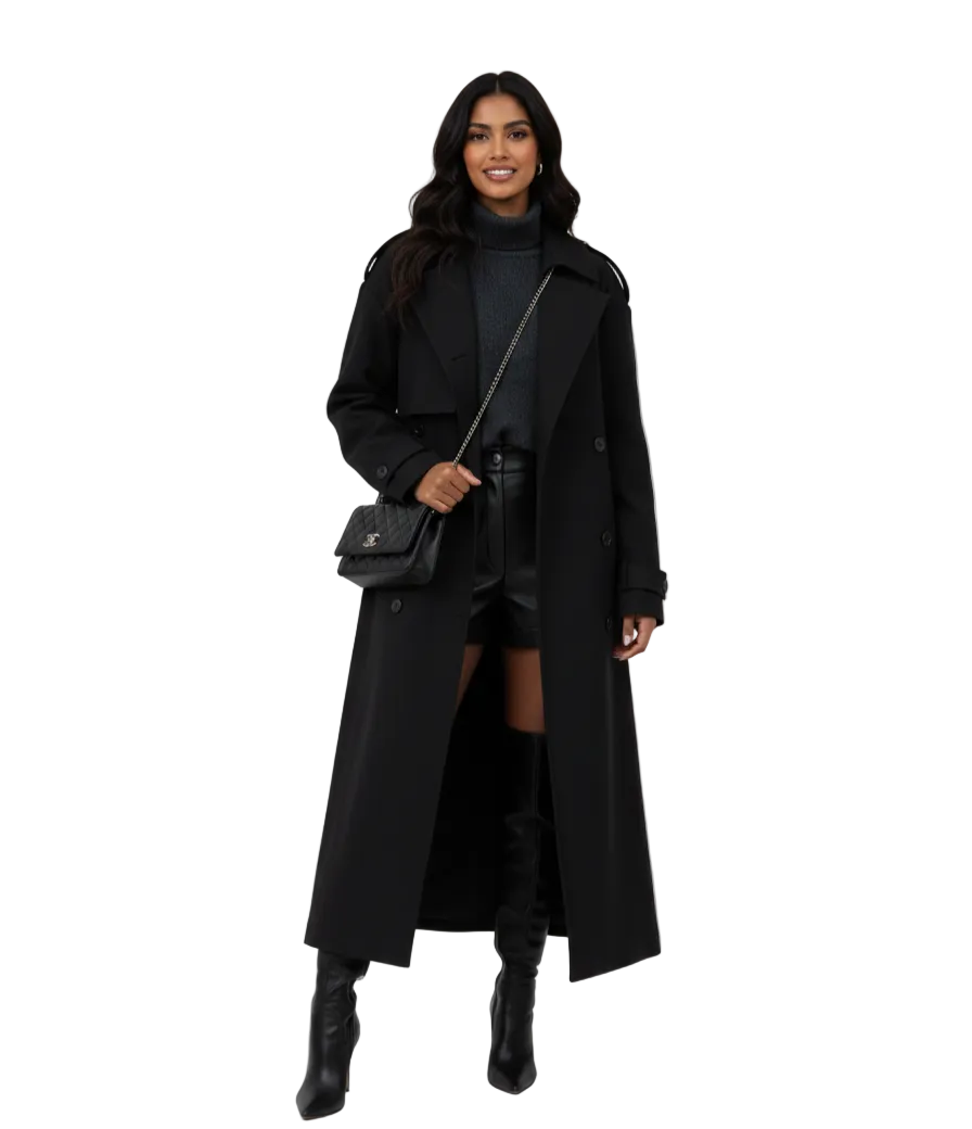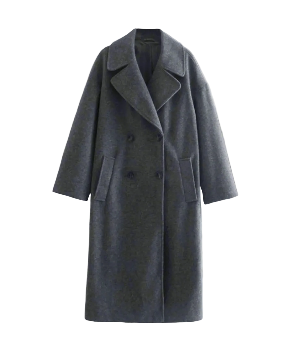 Women's Long Coat with Double-Breasted Button Closure and Wide Lapels