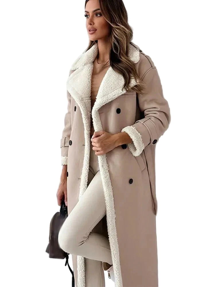 Women's Double-Breasted Coat with Lapel Collar and Plush Trim