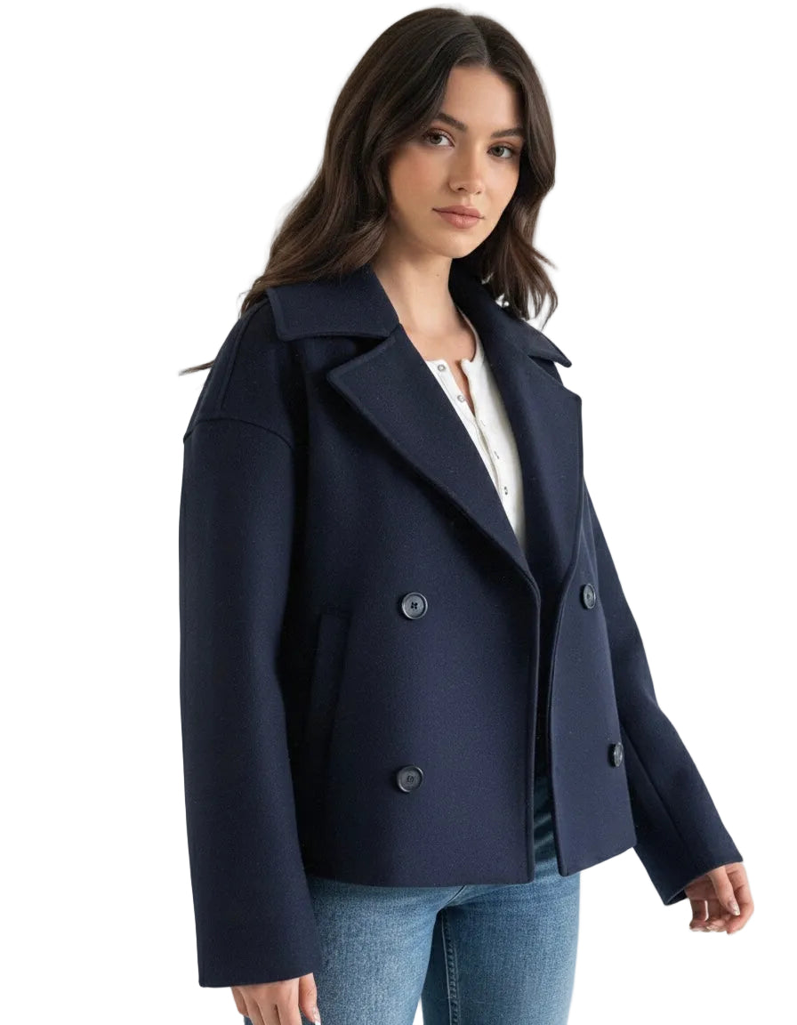 Women's Double-Breasted Cropped Trench Coat with Wide Lapels and Button Front