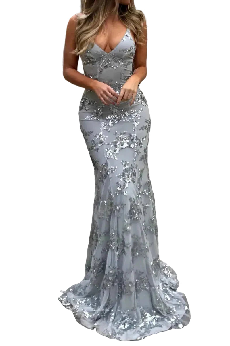 This floor-length dress for women features a deep V-neckline. The slim spaghetti straps are visible at the shoulders. The entire surface is covered with sequins. The dress has a maxi length and reaches the floor. The lower hem showcases a slightly flared finish.