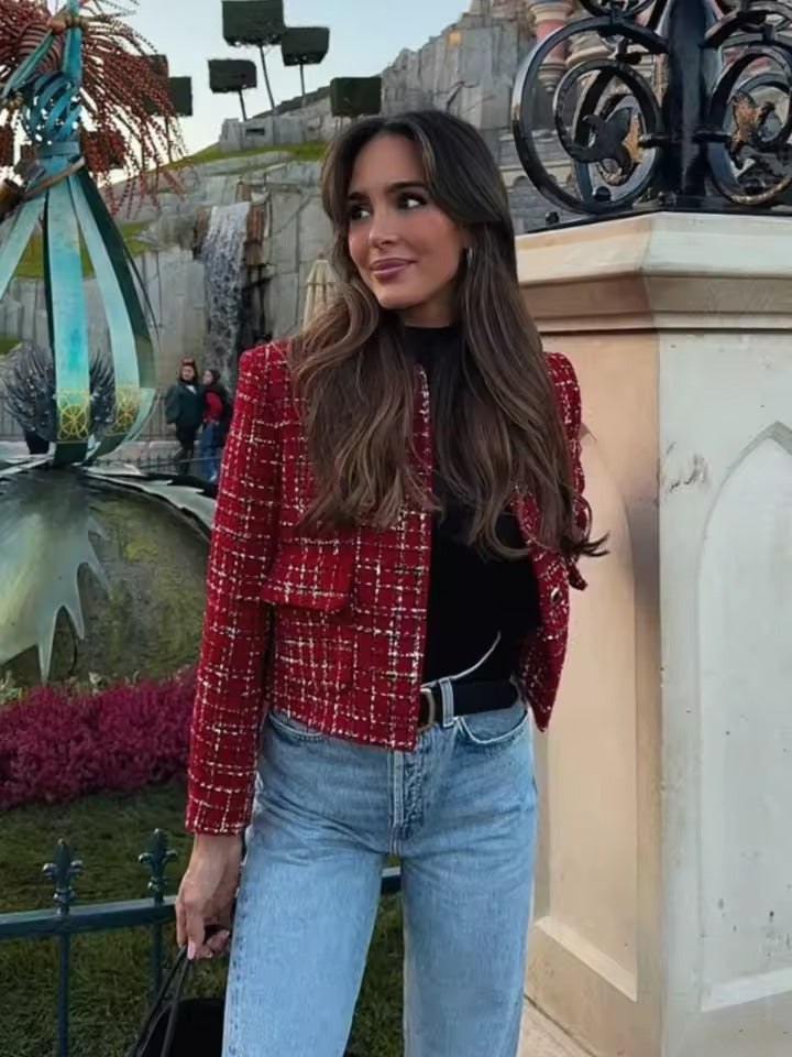This short women's jacket has a check pattern in red with white and beige lines. The jacket has a button closure at the front with three visible buttons. It has long sleeves and a lapel collar. The length ends above the hips. The surface has a woven texture.