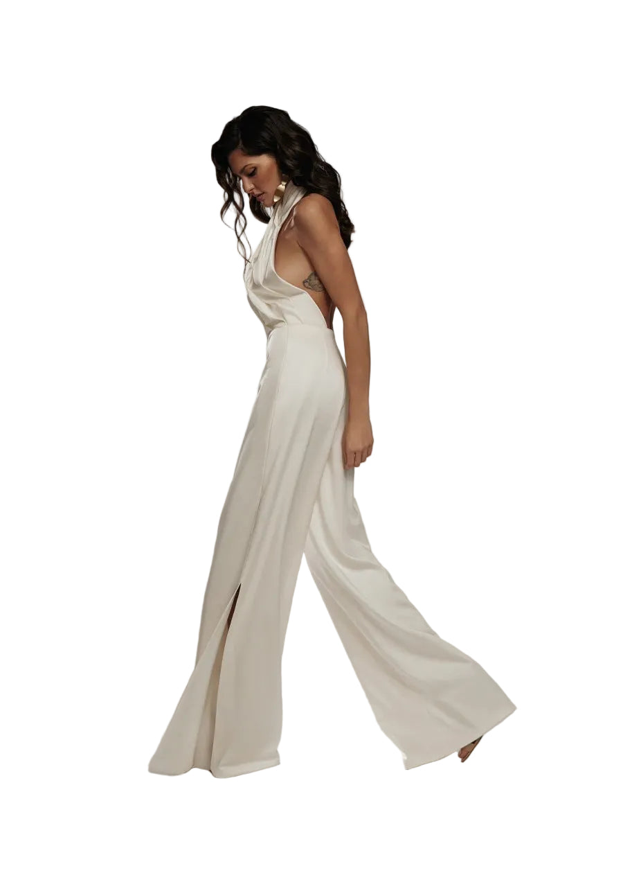 This women's jumpsuit has a halter neckline that wraps and crosses at the front. The back is open and exposed. A cutout is positioned just below the bust area. The legs are wide and extend to floor length. One leg has a side slit running along the outer edge.