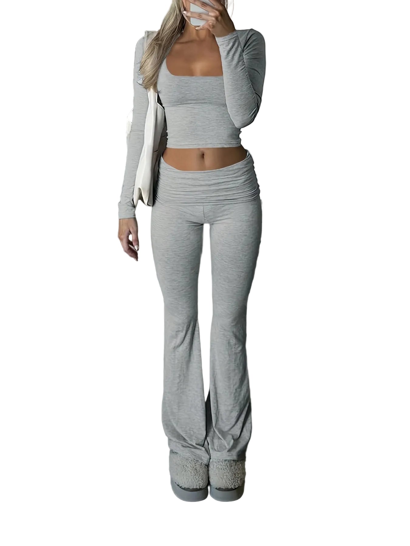 This women's two-piece set consists of a crop top and matching trousers. The top has a square neckline at the front and long sleeves extending to the wrists. The trousers have a high waist with visible gathering at the front and flared legs widening towards the hem. The surface is solid-coloured with a visible ribbed texture throughout both pieces.