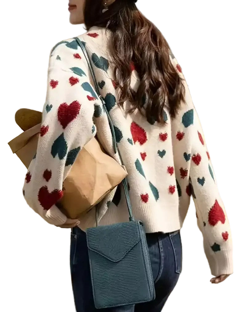 Women's Crew Neckline Sweater with Heart Motif and Long Sleeves